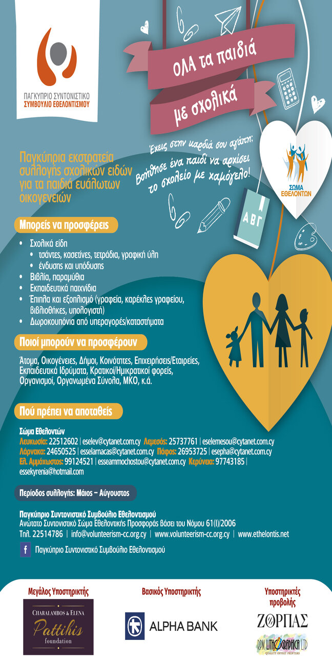 Το Παγκύπριο Συντονιστικό Συμβούλιο Εθελοντισμού (ΠΣΣΕ), ανακοινώνει την έναρξη της 11ης παγκύπριας εκστρατείας συλλογής σχολικών ειδών για τα παιδιά ευάλωτων οικογενειών «ΟΛΑ τα παιδιά με σχολικά». Σκοπός της εκστρατείας είναι να έχουν όλα τα παιδιά τα απαραίτητα σχολικά είδη τον ερχόμενο Σεπτέμβριο με την έναρξη της νέας σχολικής χρονιάς.